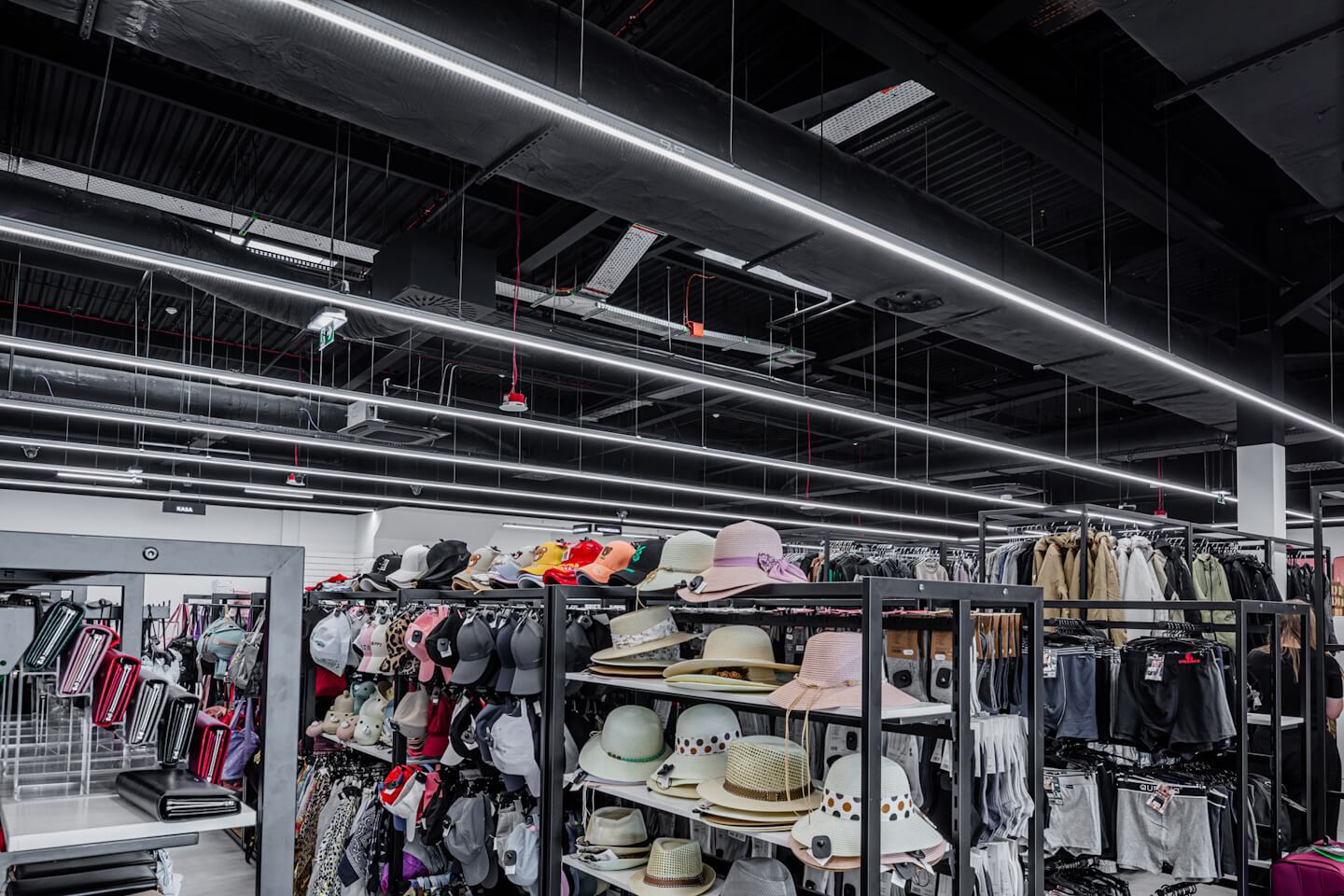 Ústředním bodem osvětlení je naše Linea 2 LED – svítidlo s širokými možnostmi přizpůsobení vyzařování světla, díky kterému jsou produkty a dekorace perfektně vystaveny. Instalaci doplňují lampy Baris 40 LED s měkkým, rovnoměrným světlem, které se ideálně hodí do měnících se interiérů.